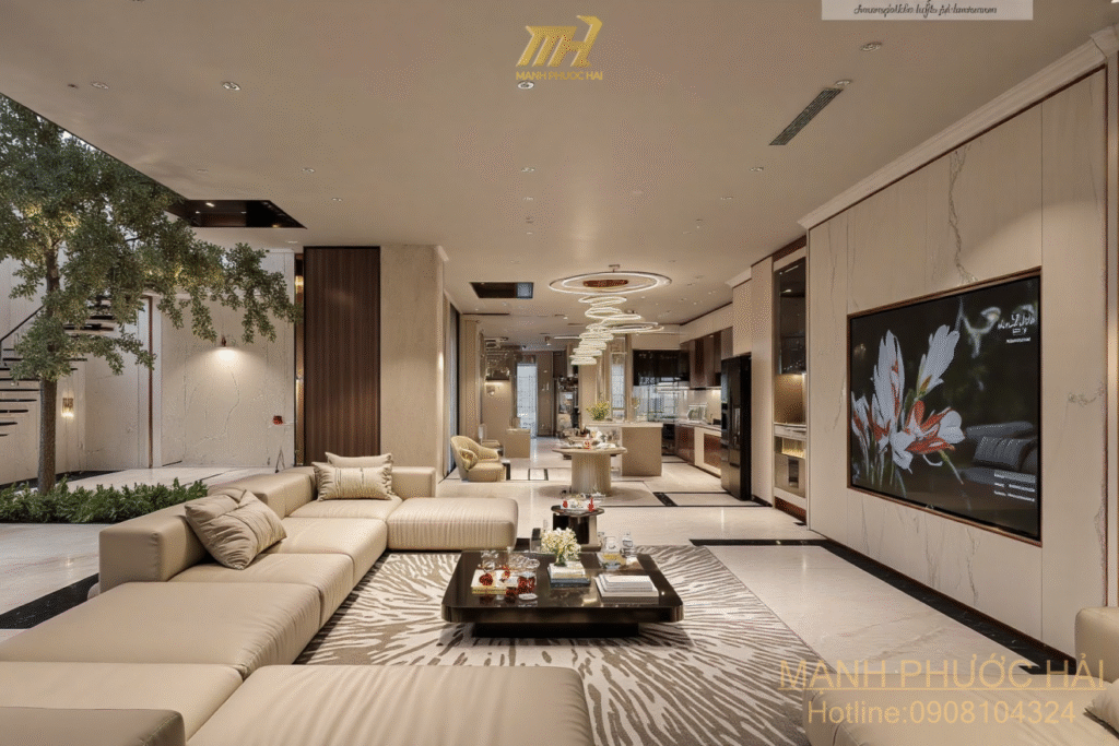 Kết nối không gian: Phòng khách – bếp – ăn không tách biệt bằng tường, mà sử dụng vách kính, kệ mở hoặc cửa trượt.